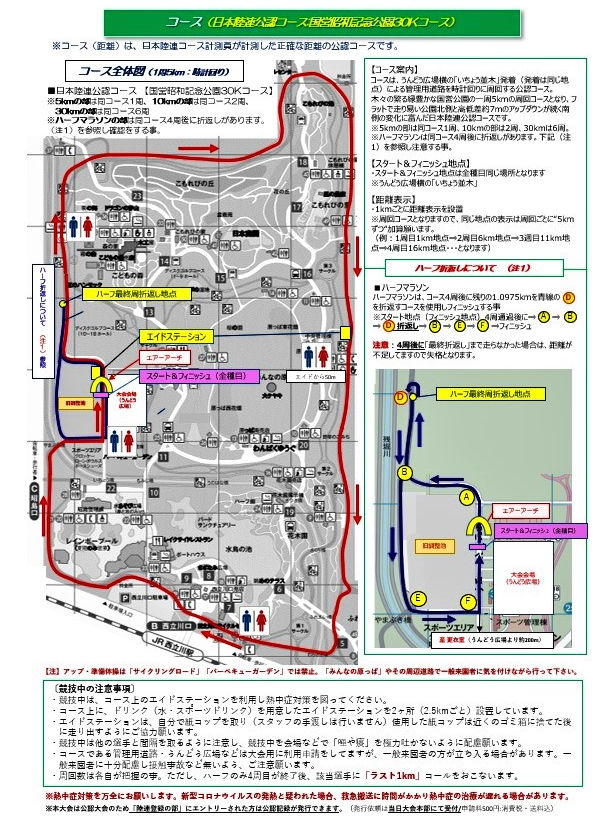 公認審判員が配置された距離の正確な公認コース。うんどう広場横「いちょう並木」を発着する公園管理用道路を時計回りに周回(一周5km)するコース。木々の繁る緑豊かな国営公園を、フラットで走り易い公園北側と高低差約7mのアップダウンが続く南側の変化に富んだ公認コース。